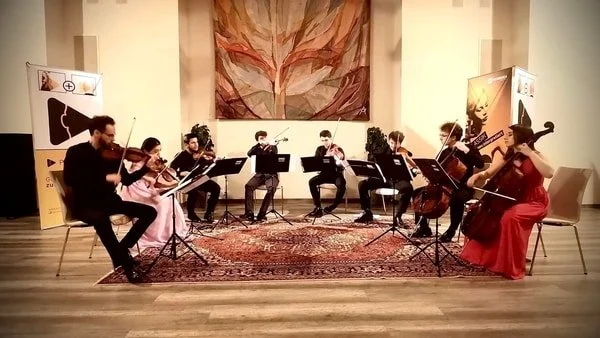 A String Octet in the most common seating arrangement. Does this ensemble look more like a small orchestra or a large chamber group?